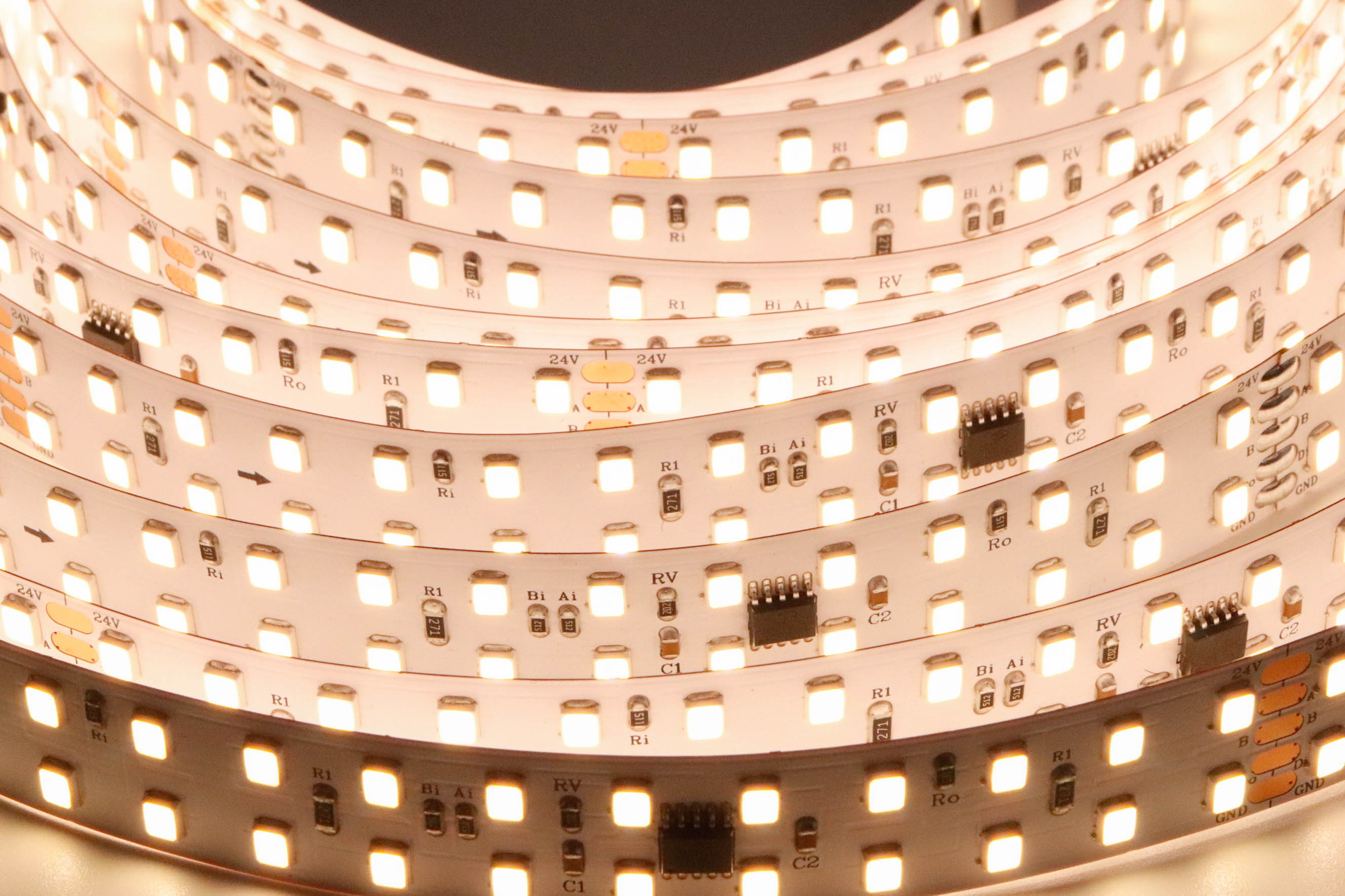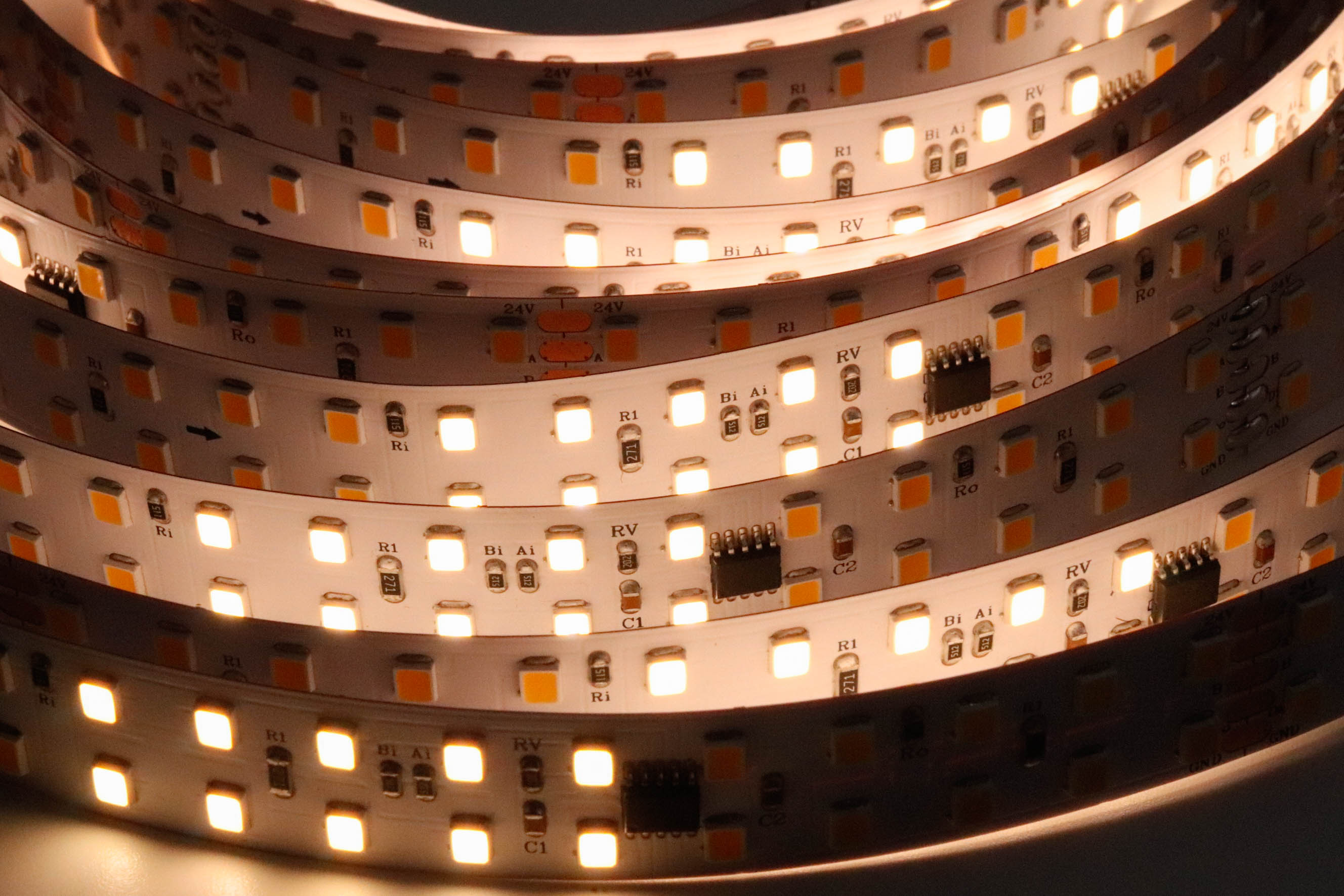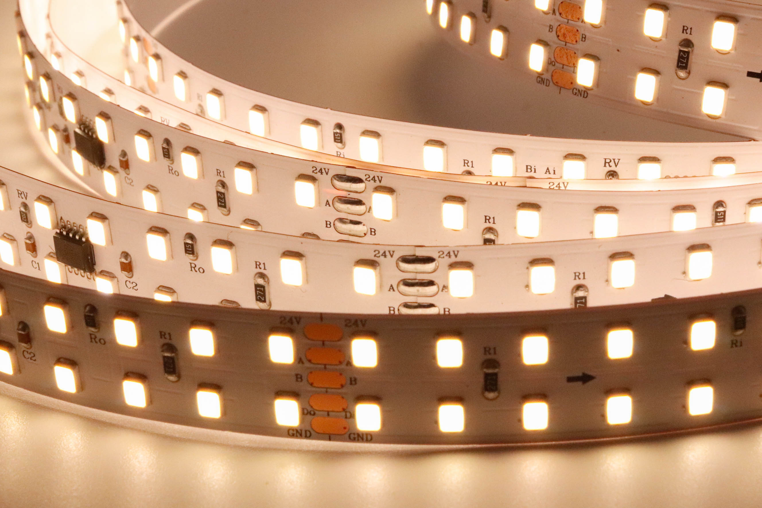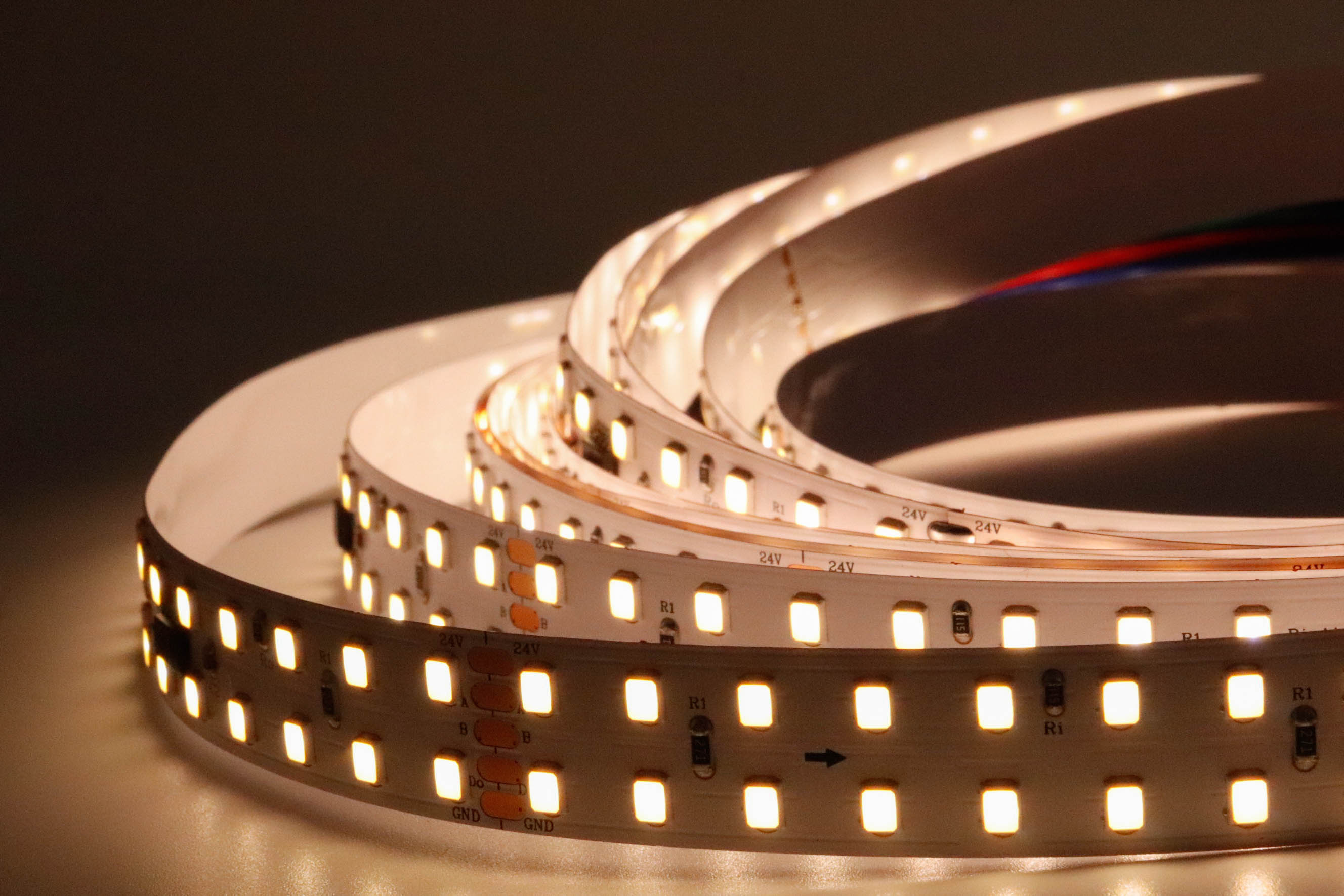 2.LED燈帶供電電壓為24V,過長使用(超過5米)壓降上升,導致尾部供電電壓不足,造成LED亮度不均勻,建議添加電源補電。