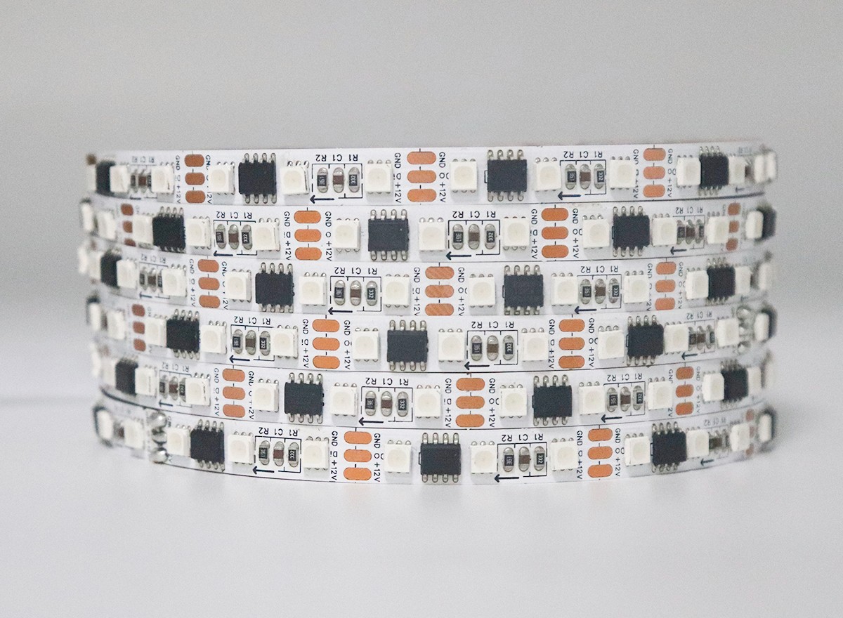 1、控制原理:一個(gè)IC控制3顆LED組成一個(gè)回路(一組),控制器通過(guò)控制IC對(duì)FPCB里面的電路進(jìn)行控制,從而控制LED燈條變化不同的效果;如閃爍,追逐,跳變,順時(shí)針跑馬,逆時(shí)針跑馬,單色跑馬,變色跑馬,單顆追逐從頭到尾,流水,模擬閃電等;也可以根據(jù)客戶(hù)需要,自行編寫(xiě),編寫(xiě)出所有想要的效果。