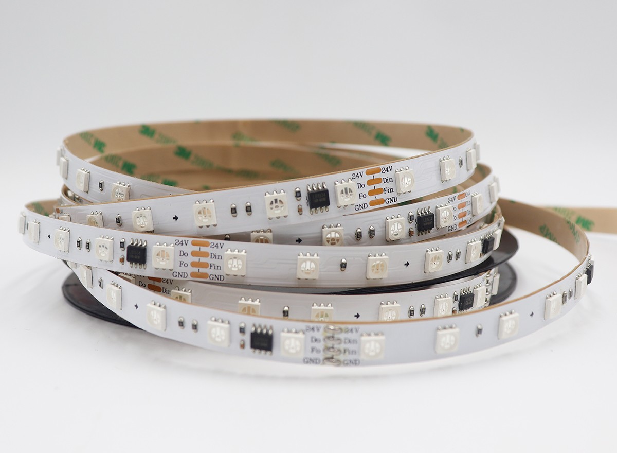 1、控制原理:一個(gè)IC控制3顆LED組成一個(gè)回路(一組),控制器通過(guò)控制IC對(duì)FPCB里面的電路進(jìn)行控制,從而控制LED燈條變化不同的效果;如閃爍,追逐,跳變,順時(shí)針跑馬,逆時(shí)針跑馬,單色跑馬,變色跑馬,單顆追逐從頭到尾,流水,模擬閃電等;也可以根據(jù)客戶需要,自行編寫,編寫出所有想要的效果。