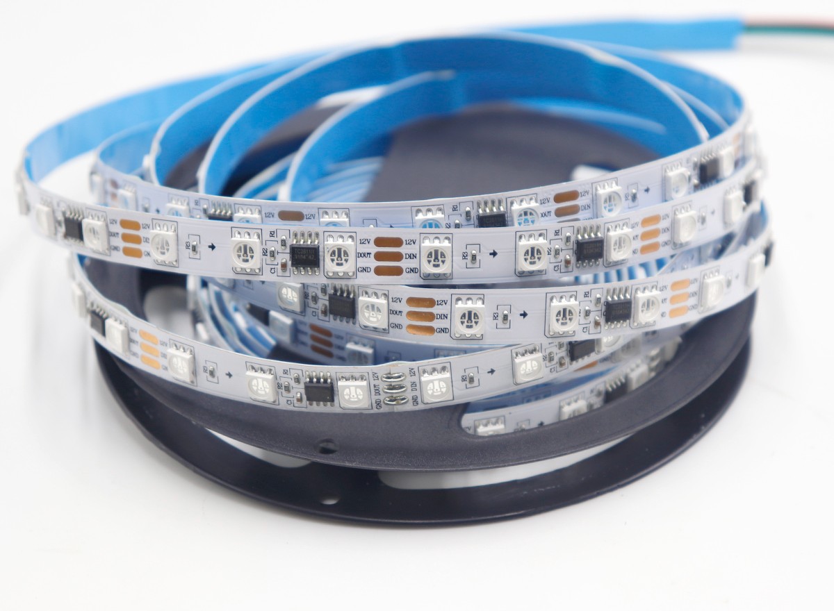 1、控制原理:一個(gè)IC控制三顆LED組成一個(gè)回路(一組),控制器通過(guò)控制IC對(duì)FPCB里面的電路進(jìn)行控制,從而控制LED燈條變化不同的效果;如閃爍,追逐,跳變,順時(shí)針跑馬,逆時(shí)針跑馬,單色跑馬,變色跑馬,單顆追逐從頭到尾,流水,模擬閃電等;也可以根據(jù)客戶需要,自行編寫(xiě),編寫(xiě)出所有想要的效果。