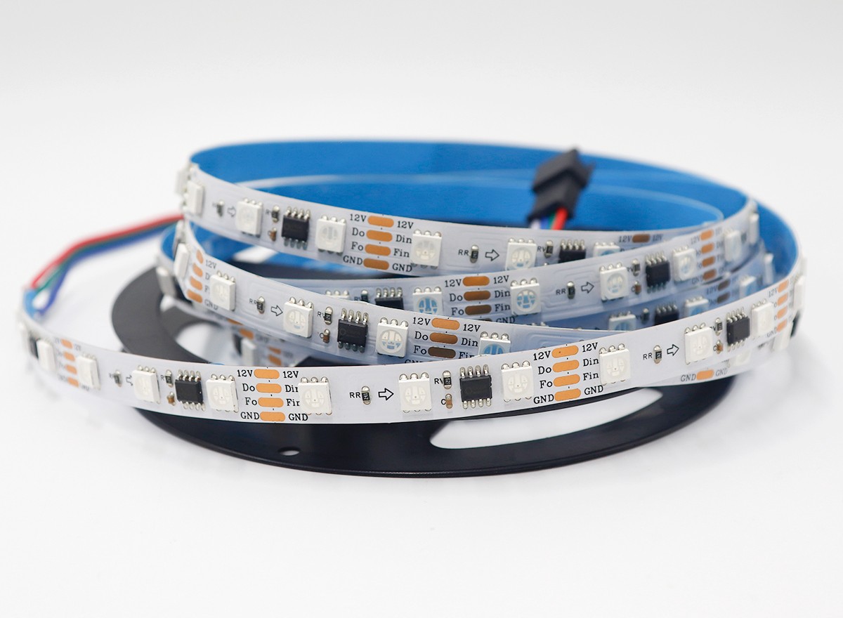 1、控制原理:一個(gè)IC控制3顆LED組成一個(gè)回路(一組),控制器通過(guò)控制IC對(duì)FPCB里面的電路進(jìn)行控制,從而控制LED燈條變化不同的效果;如閃爍,追逐,跳變,順時(shí)針跑馬,逆時(shí)針跑馬,單色跑馬,變色跑馬,單顆追逐從頭到尾,流水,模擬閃電等;也可以根據(jù)客戶需要,自行編寫,編寫出所有想要的效果。