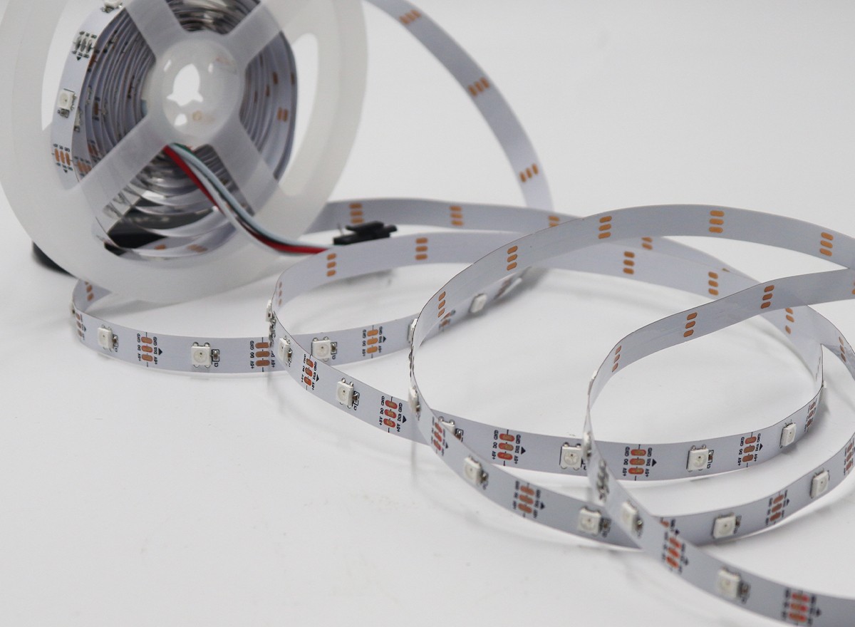 1、控制原理:一個(gè)IC控制1顆LED組成一個(gè)回路(一組),控制器通過(guò)控制IC對(duì)FPCB里面的電路進(jìn)行控制,從而控制LED燈條變化不同的效果;如閃爍,追逐,跳變,順時(shí)針跑馬,逆時(shí)針跑馬,單色跑馬,變色跑馬,單顆追逐從頭到尾,流水,模擬閃電等;也可以根據(jù)客戶需要,自行編寫,編寫出所有想要的效果。