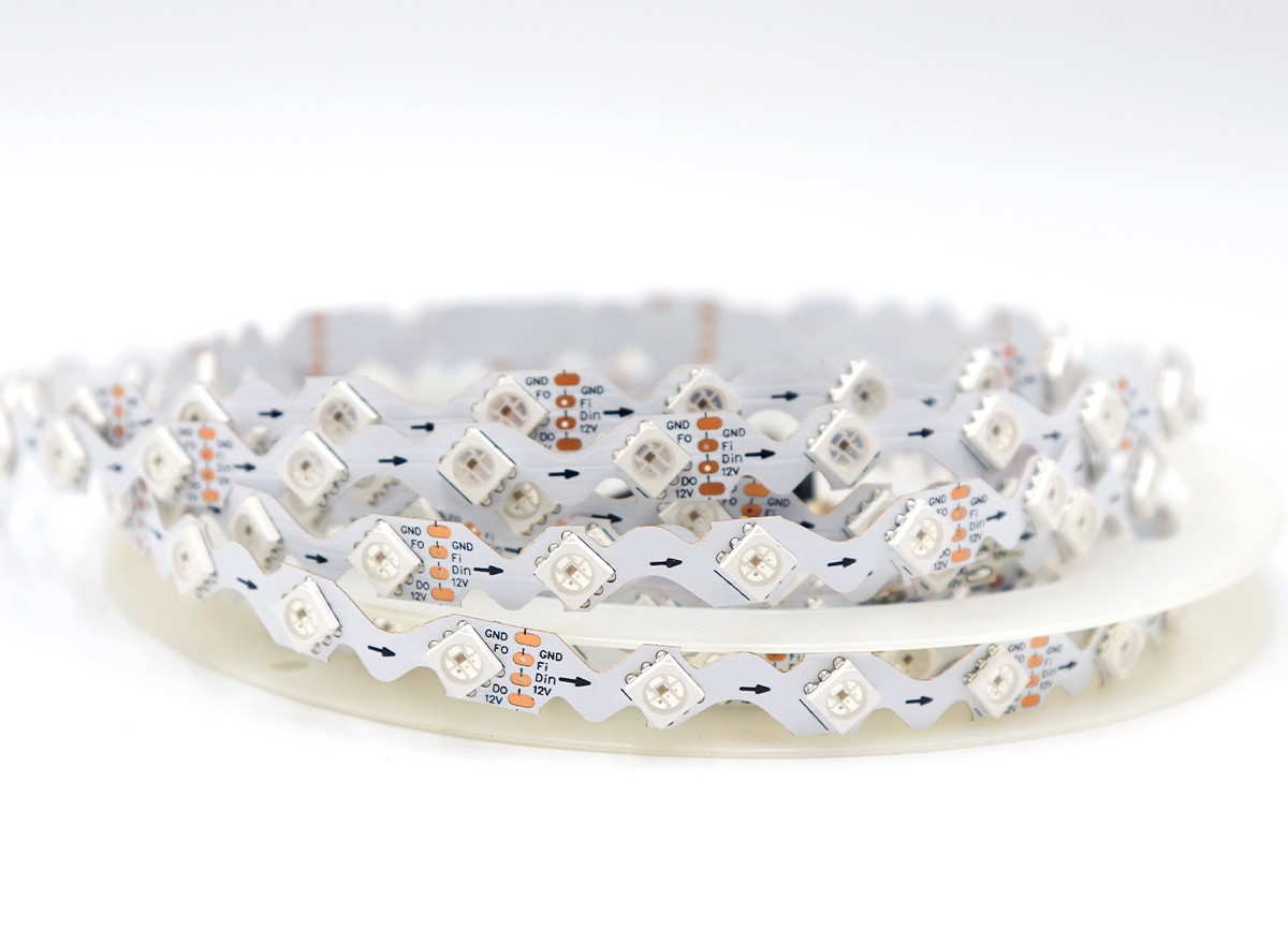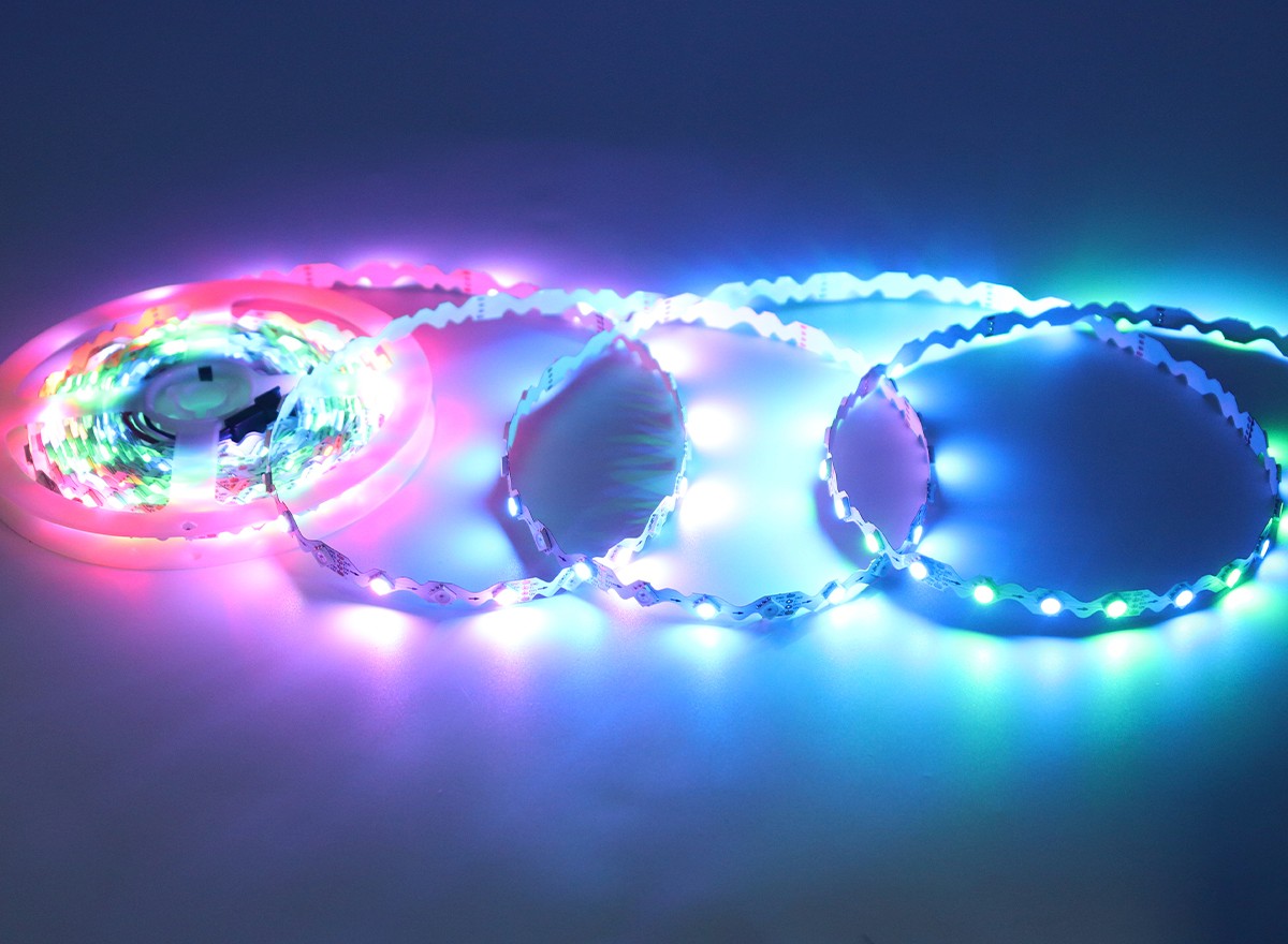 1、控制原理:一個IC控制3顆LED組成一個回路(一組),控制器通過控制IC對FPCB里面的電路進行控制,從而控制LED燈條變化不同的效果;如閃爍,追逐,跳變,順時針跑馬,逆時針跑馬,單色跑馬,變色跑馬,單顆追逐從頭到尾,流水,模擬閃電等;也可以根據(jù)客戶需要,自行編寫,編寫出所有想要的效果。